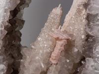 Bordered by a thick, blueish agate layer, this wonderful slice preserves an interior of large white quartz crystals with a prominent central calcite. The calcite itself is overlaid in amethystine quartz, in another example of epimorphism, with further pinkish ‘frosted' quartz projections.
