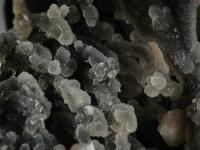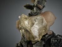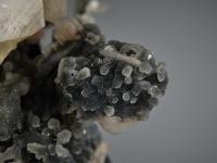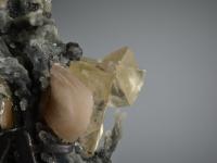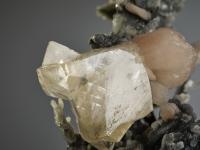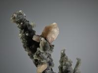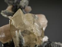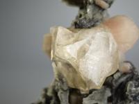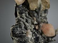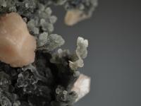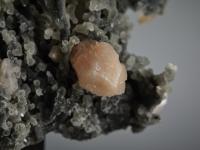 This charming specimen features lustrous apophyllite crystals beautifully set on a bed of dark grey quartz, accented by delicate pink stilbite clusters of varying sizes. The interplay between the soft pastel tones of stilbite, the creamy apophyllite, and the deep quartz background creates a striking visual contrast.