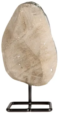 A stunning intense brown amethyst druze formation with stalactites. The mineral sculpture is embellished by multiple stalactite formations, and gives the sensation of movement due to its wavy shape. The edges have been polished, revealing a vibrant combination of deep green celadonite, brown-grey agate and white quartz that frames and intensifies the beautiful and unusual colour of the piece. The back of the piece maintains its rough basalt condition allowing us to imagine how it was spotted and formed inside the cavities of volcanic rock millions of years ago. This stunning piece is very decorative due to its colour and size, and is displayed on a custom metal stand.