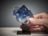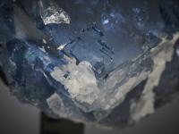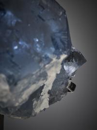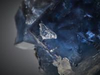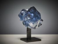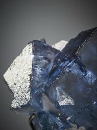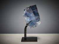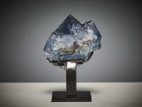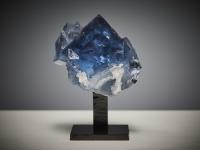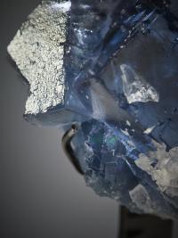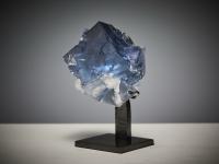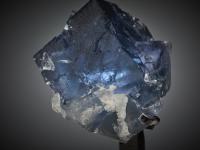 This striking specimen from La Viesca mine, La Collada, Huergo, Siero, Asturias, Spain features a magnificent deep blue fluorite cube beautifully accented by a delicate layer of white quartz crystals. The fluorite exhibits superb transparency, sharp edges, and rich internal reflections that create remarkable depth and luminosity.