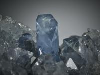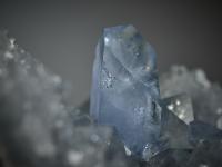 A mesmerising celestite geode from Sakoany, Majunga, Madagascar, displaying crystals of varying sizes in a graceful, natural composition. At the centre rises a prominent, well-formed crystal, surrounded by a delicate cluster of smaller ones that reflect soft light from every angle.