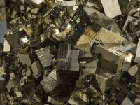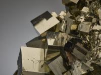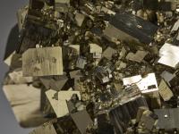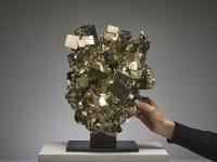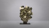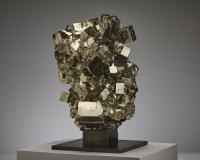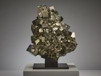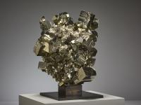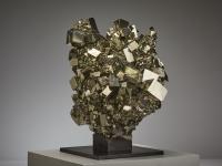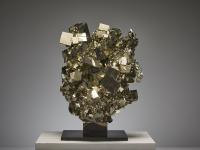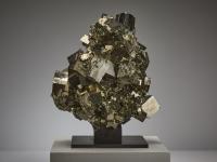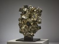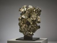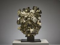 The specimen exhibits an intense metallic lustre, each cube reflecting light like polished gold. Its large size and architectural geometry make it a truly eye-catching centrepiece, radiating brilliance and strength — an outstanding example of Peru’s world-class pyrite at its most magnificent.
