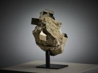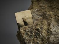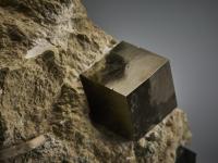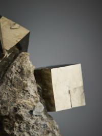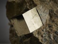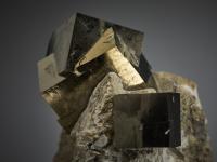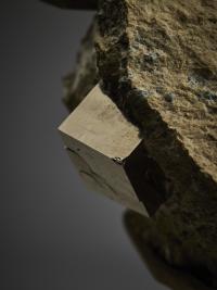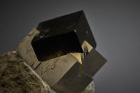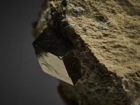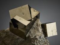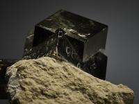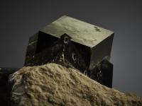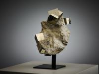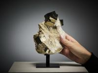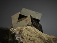 An exceptional specimen of golden pyrite from the famous Navajún Mine, La Rioja, Spain, featuring perfect cubes of different sizes beautifully distributed across the natural limestone matrix. The highlight of the piece is the striking formation at the top, where two cubes are perfectly superimposed one over the other, creating a unique and sculptural composition.