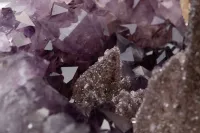 An incredible amethyst formation with central calcite arch and calcite spear. Two special calcite formations are shown here; the first is a beautiful arch covered with a blanket of rare red/brown druze and white quartz, and the second is a beautiful, symetrical spear.