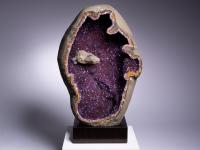 This split geode reveals an incredibly intense amethyst with a calcite to the upper left.