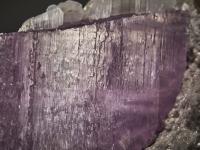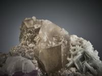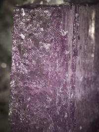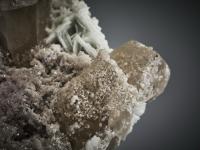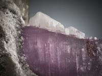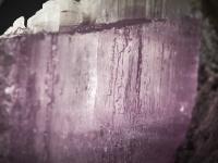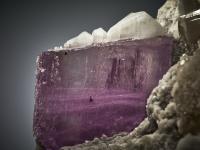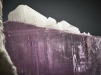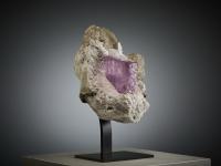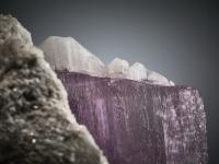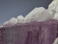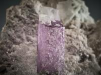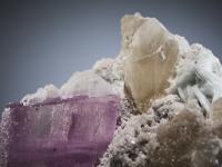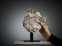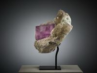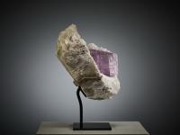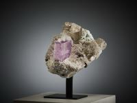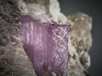An exceptional specimen featuring a vivid pink Kunzite crystal partially covered by delicate white quartz, with fine calcite and mica accents adding texture and contrast. The Kunzite shows superb clarity and sharp termination, and when light passes through it, the colour transforms into a deep, intense pink, revealing its remarkable pleochroic nature.
