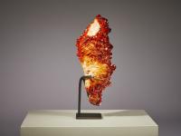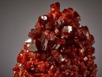 Behold the vibrant beauty of this intense red vanadinite, originating from the mineral-rich regions of Morocco. This striking specimen is adorned with a dazzling array of crystals, showcasing a spectrum of colors from fiery orange to sunny yellow, all harmoniously blending to create a mesmerizing visual experience.
