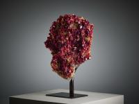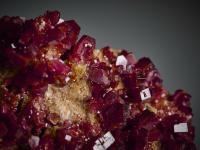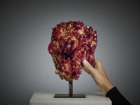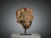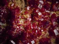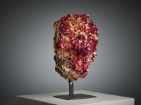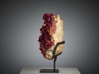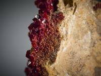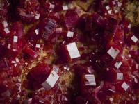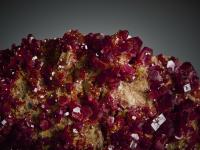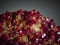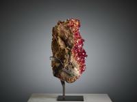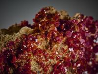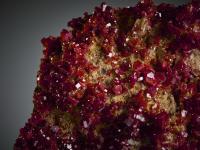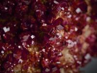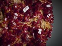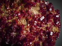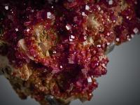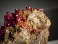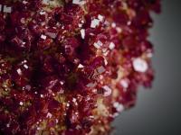 A striking specimen of vanadinite from Morocco, displaying an intense deep red colour and remarkable lustre. The surface is covered with brilliant, well-formed crystals of varying sizes, creating a dynamic and vibrant texture that captures the light from every angle.